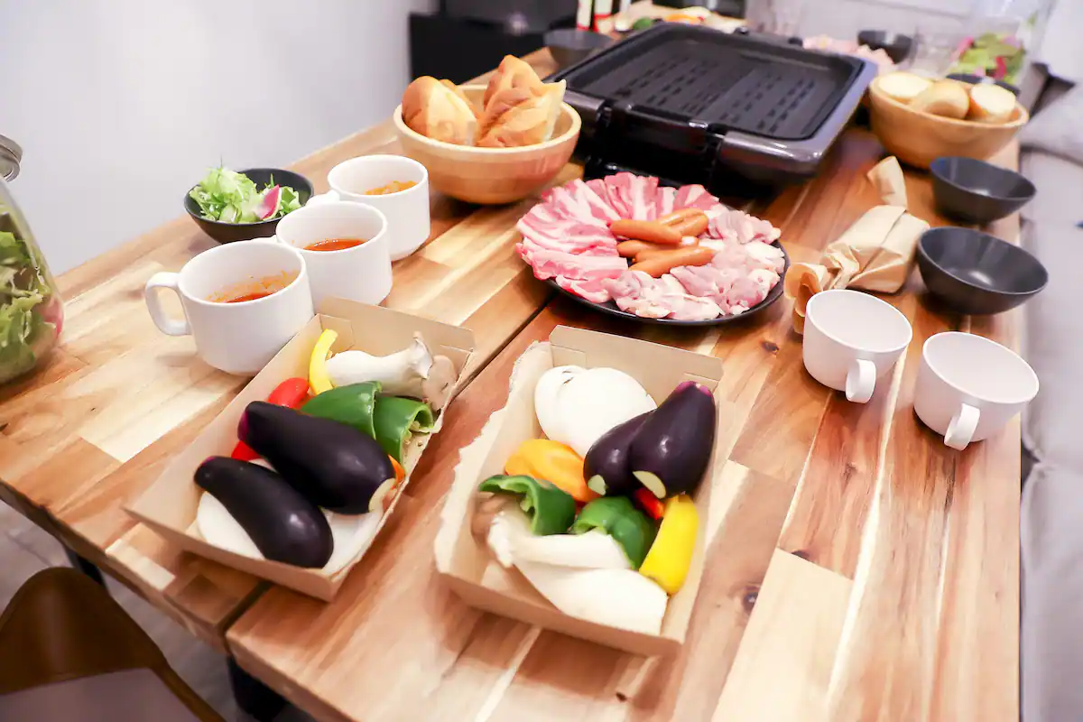 ホットプレートの貸出が可能です。食材を持ち寄って焼き肉を楽しめます。お食事プランの焼き肉セットもございます。