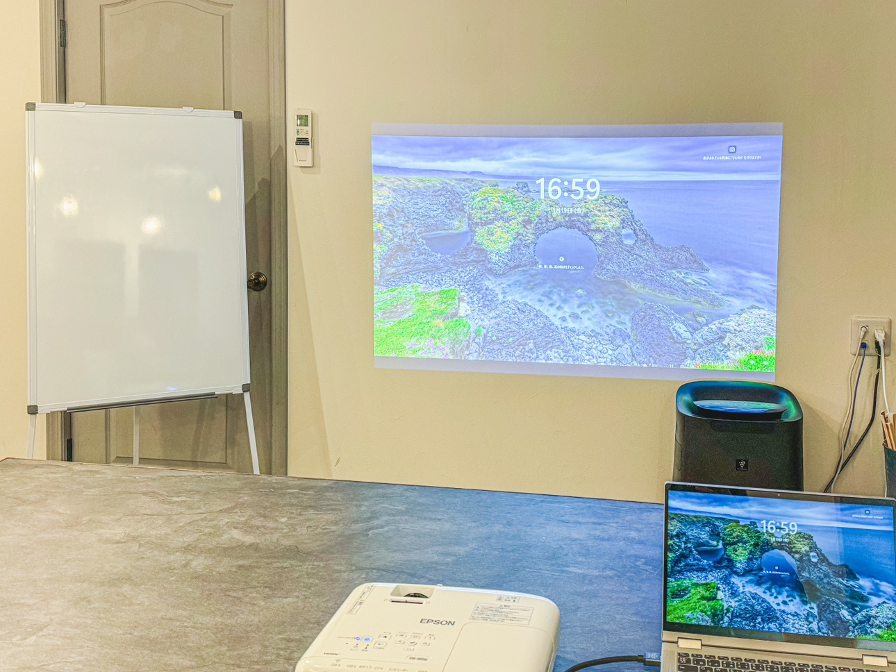 ご用意しているプロジェクターやホワイトボードを自由に利用可能です。いつもとは違う環境で、生産性の高い会議を